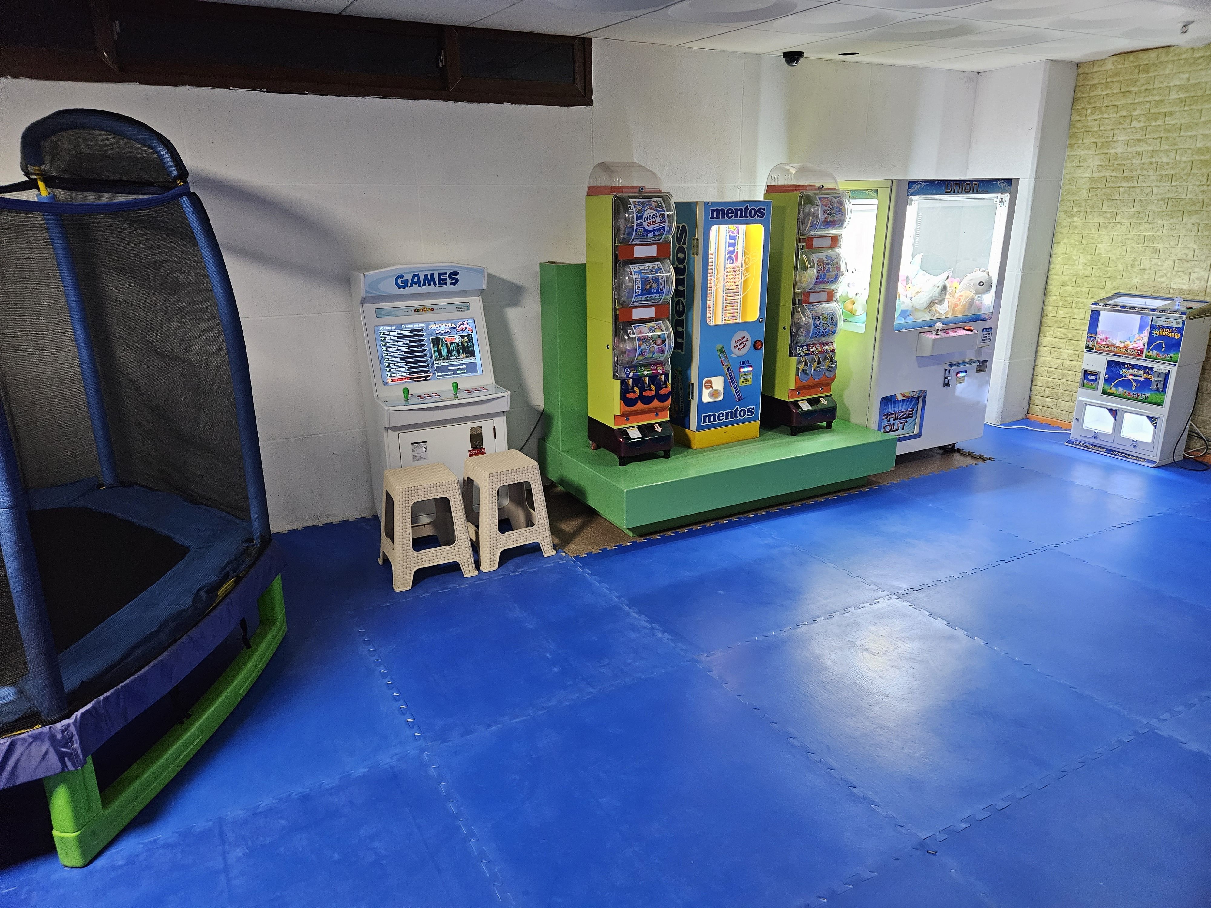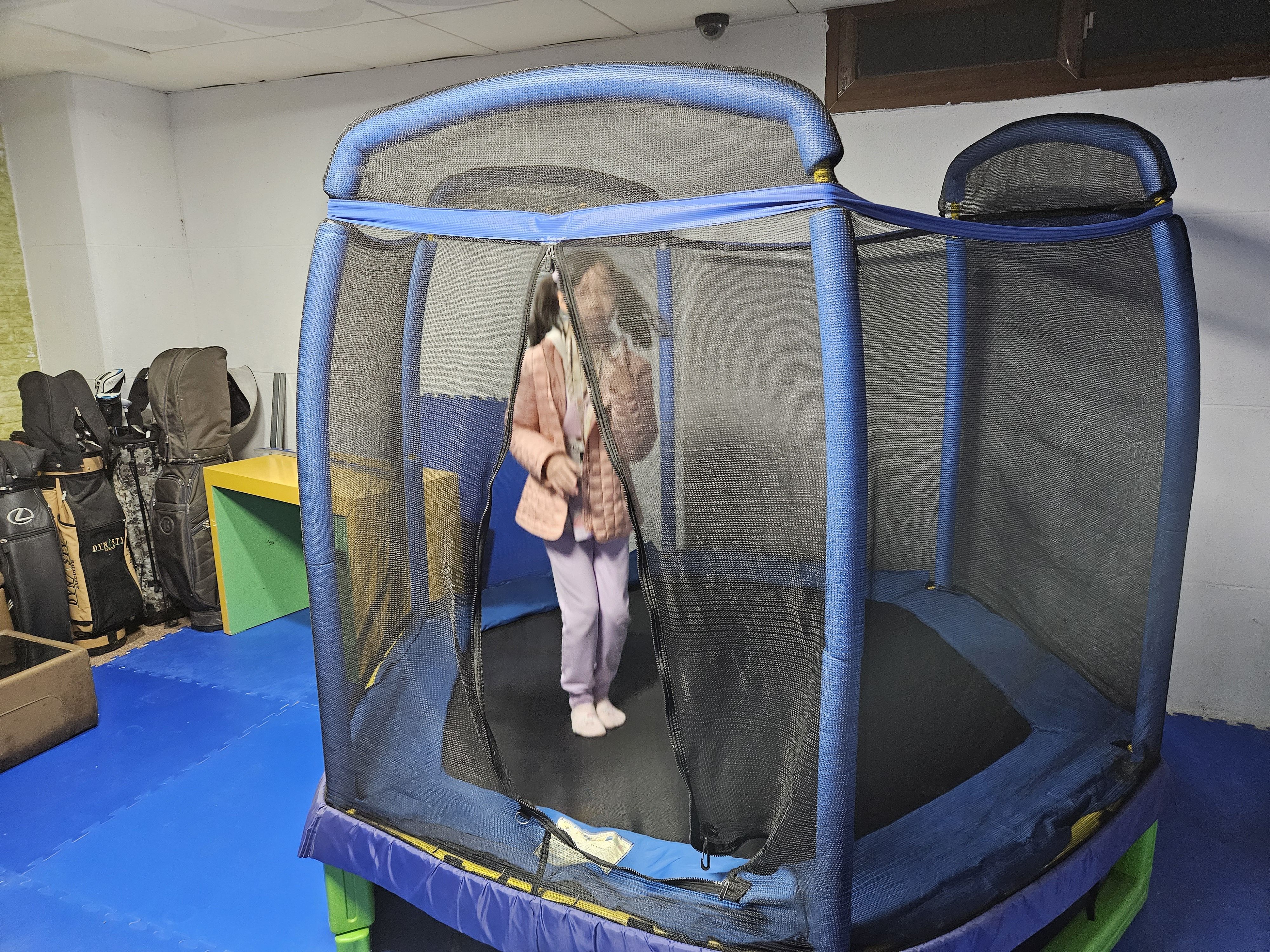 주차장은 8대 정도 댈 수 있는데, 지하에 트램폴린과 간단한 게임 및 인형뽑기가 있어서 아이들에게 재미를 선사할 수 있다.