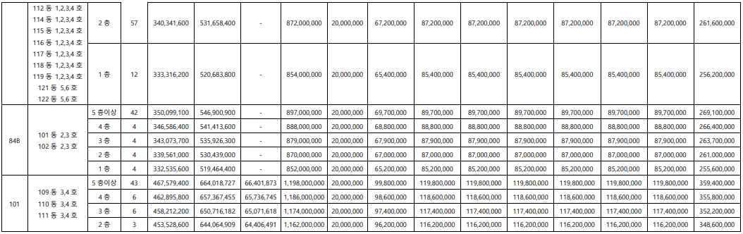 전용면적별로 살펴보면 48㎡A형 22세대, 48㎡B형 9세대, 59㎡B형 62세대, 59㎡C형 108세대, 71㎡A형 196세대, 71㎡B형 45세대, 84㎡A형 676세대, 84㎡B형 58세대, 101㎡형 58세대로 구성된다.