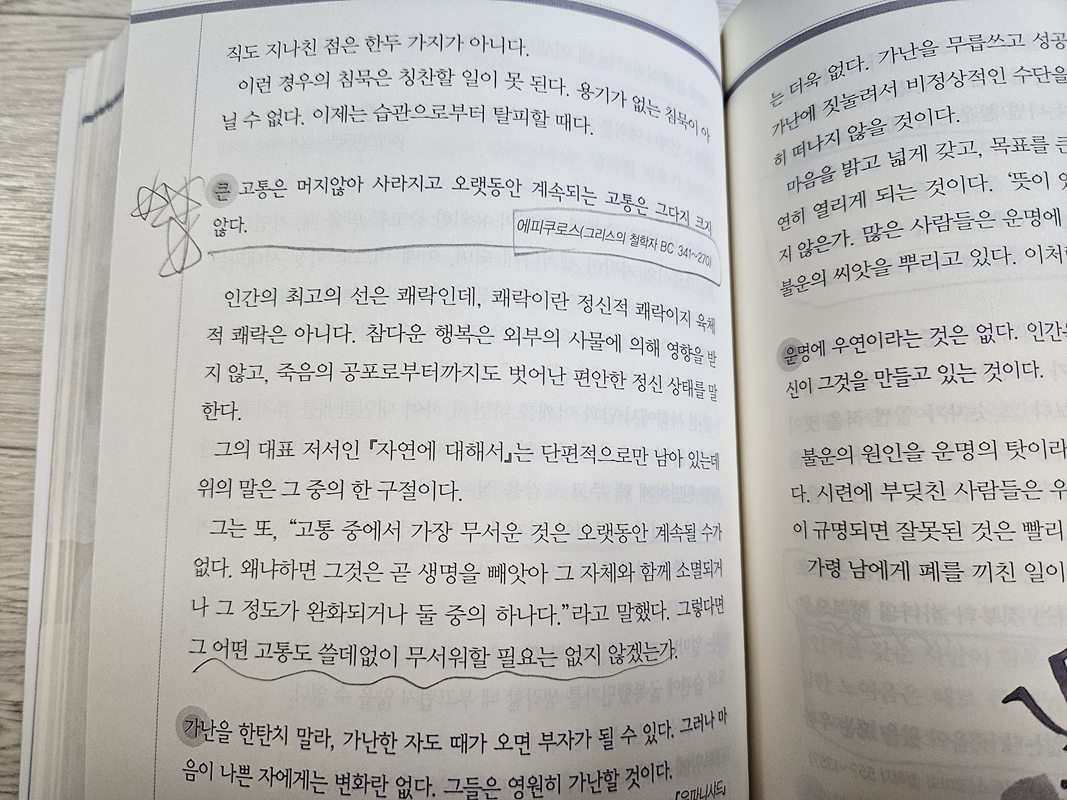 큰 고통은 머지않아 사라지고 오랫동안 계속되는 고통은 그다지 크지 않다. - 에피쿠로스
