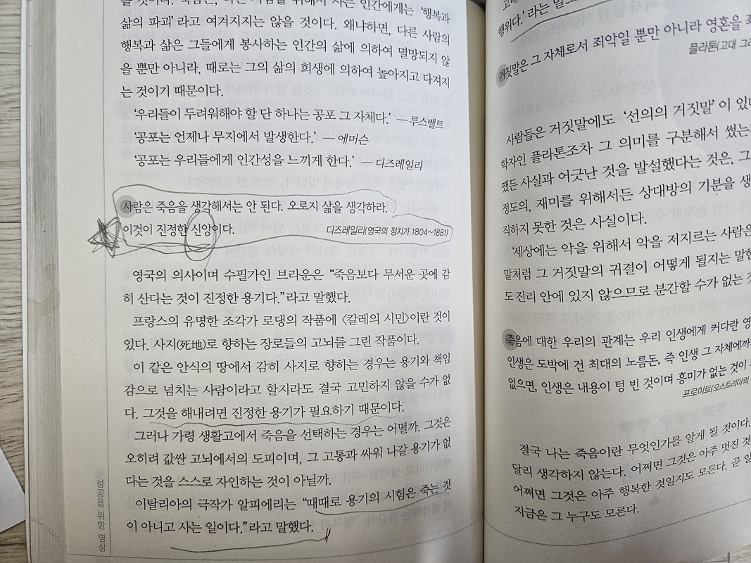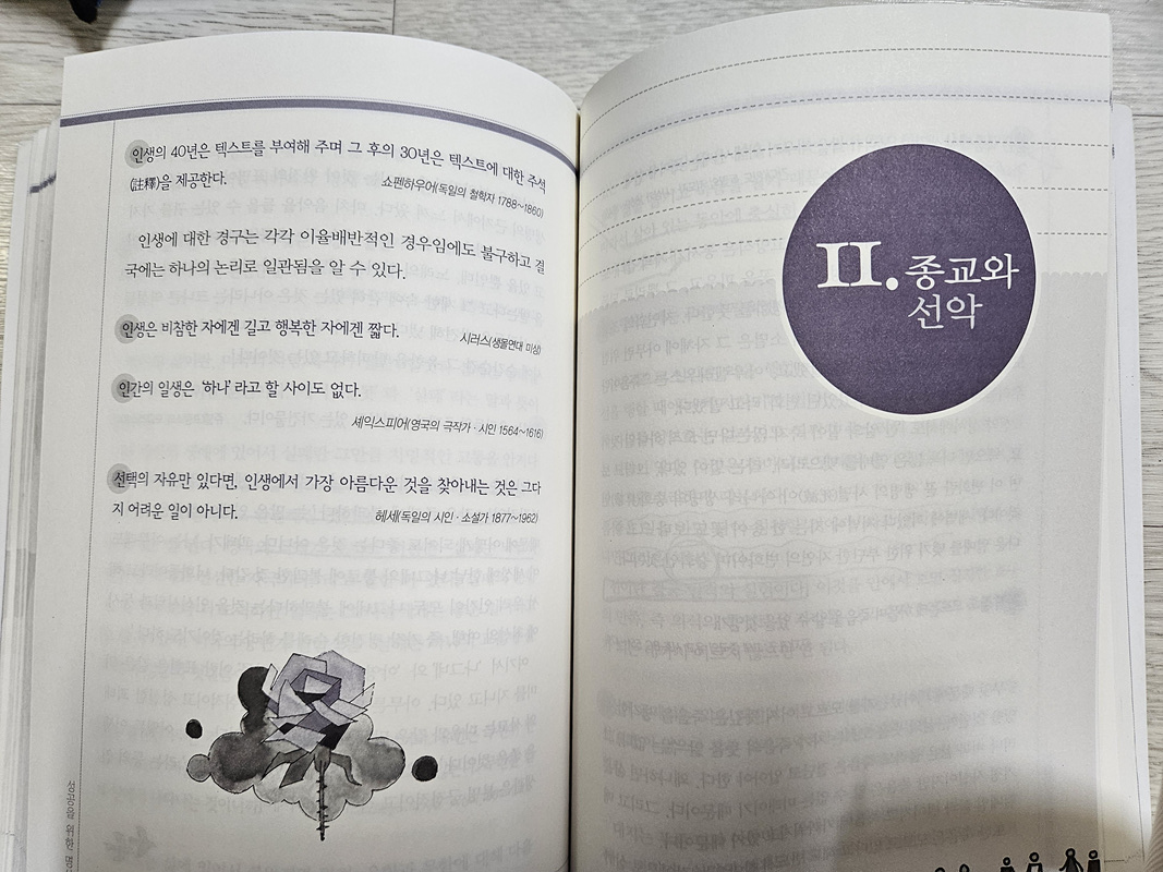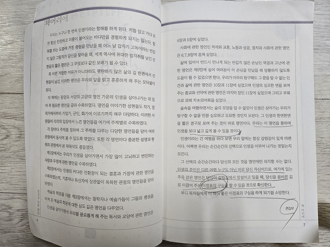 머리글에서 '인생의 주인은 다른 어떤 누구도 아닌 바로 당신 자신이므로, 여기에 있는 주옥같은 명언은 당신이 갈림길에서 망설이고 있을 때, 당신을 올바른 길로 이끌어 주는 이정표 역할을 할 거다.'라는 말이 이 책을 선택한 동기가 아닐 수 없다.
