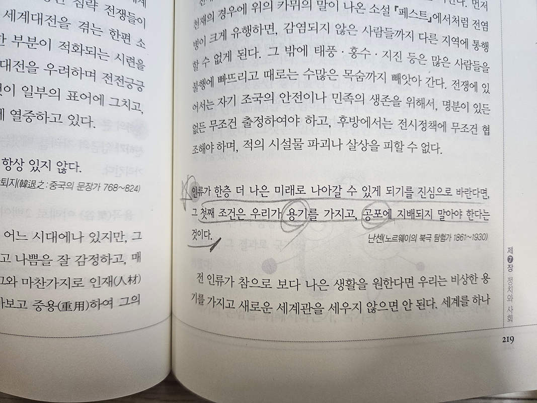 인류가 한층 더 나은 미래로 나아갈 수 있게 되기를 진심으로 바란다면, 그 첫째 조건은 우리가 용기를 가지고, 공포에 지배되지 말아야 한다는 것이다. - 난센