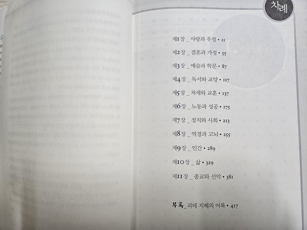 이 책은 11장으로 구성돼 있고, 부록으로 괴테 지혜의 어록이 포함돼 있다.