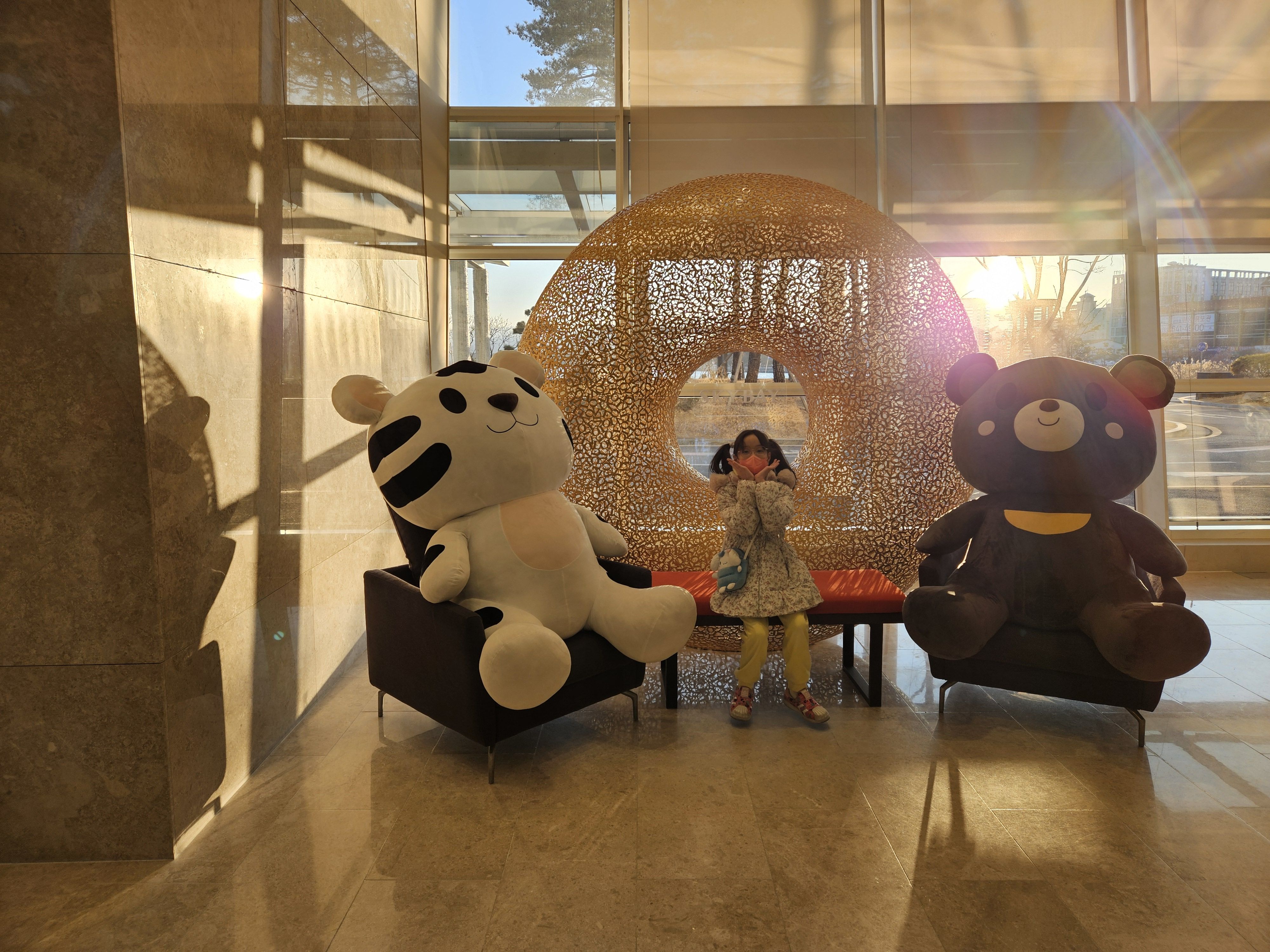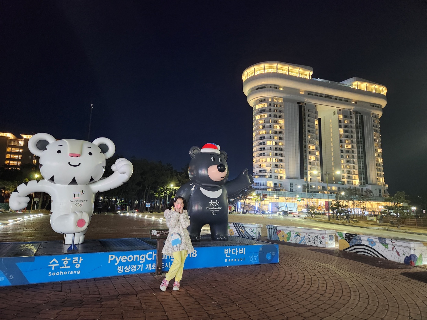 호텔 로비에서 수호랑과 반다비 마스코트를 배경으로 추억을 남길 수 있게 해놨다.
