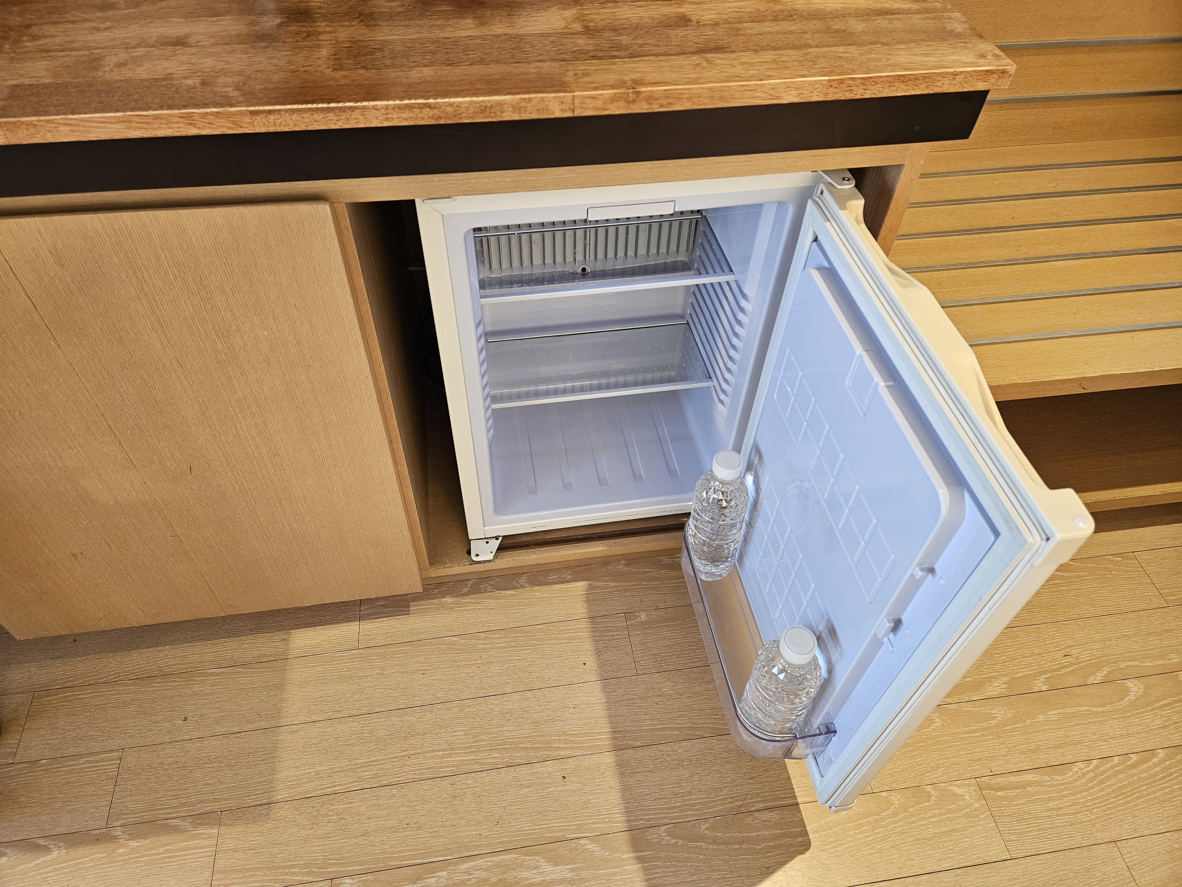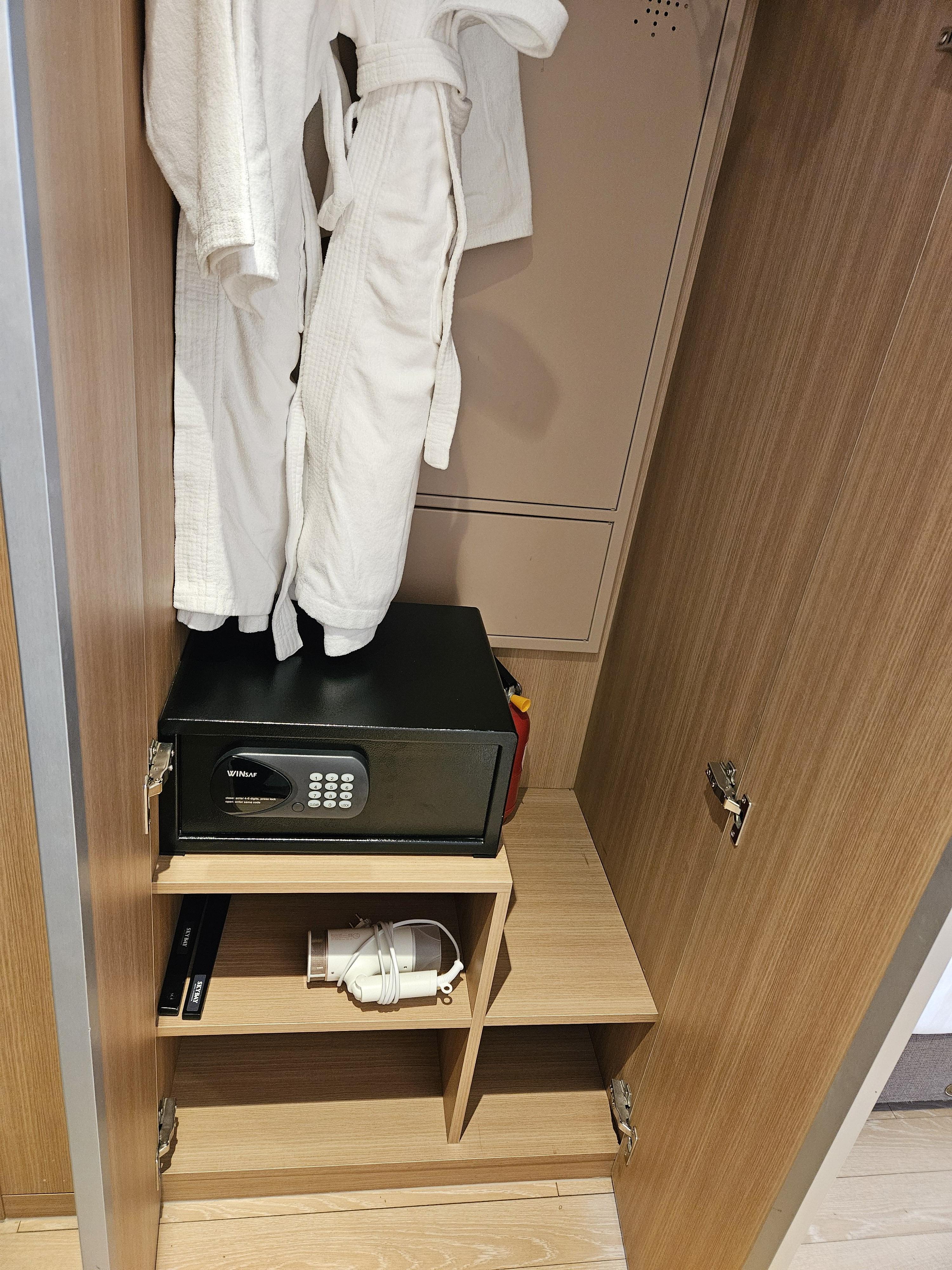 기본적으로 tv, 커피포트, 이디야 블랙커피 2개, 냉장고, 생수 2병, 인터넷 가능한 테블릿, 스탠드, 미니금고