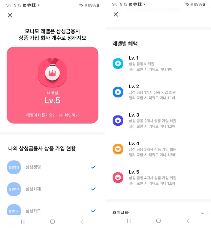 모니모 레벨은 삼성금융사 상품 가입 회사 개수로 정해진다는 점!
