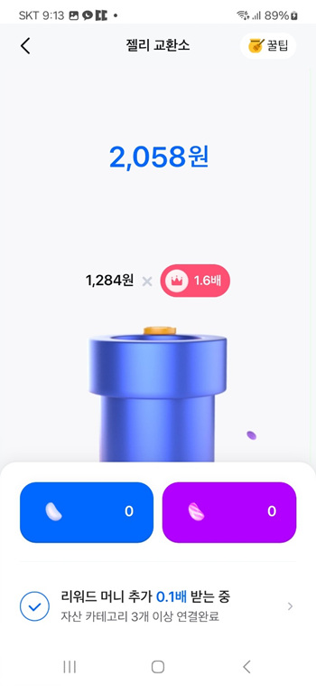나는 삼성 금융 4개사 모두 가입돼 있어서 젤리 교환시 리워드 머니가 1.5배 적용을 받고 있다.