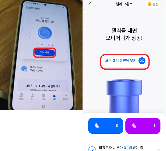 이렇게 젤리를 모았다면, 젤리 교환소에서 모든 젤리 한번에 넣기를 클릭해서 환전을 할 수 있다. ㅋㅋ