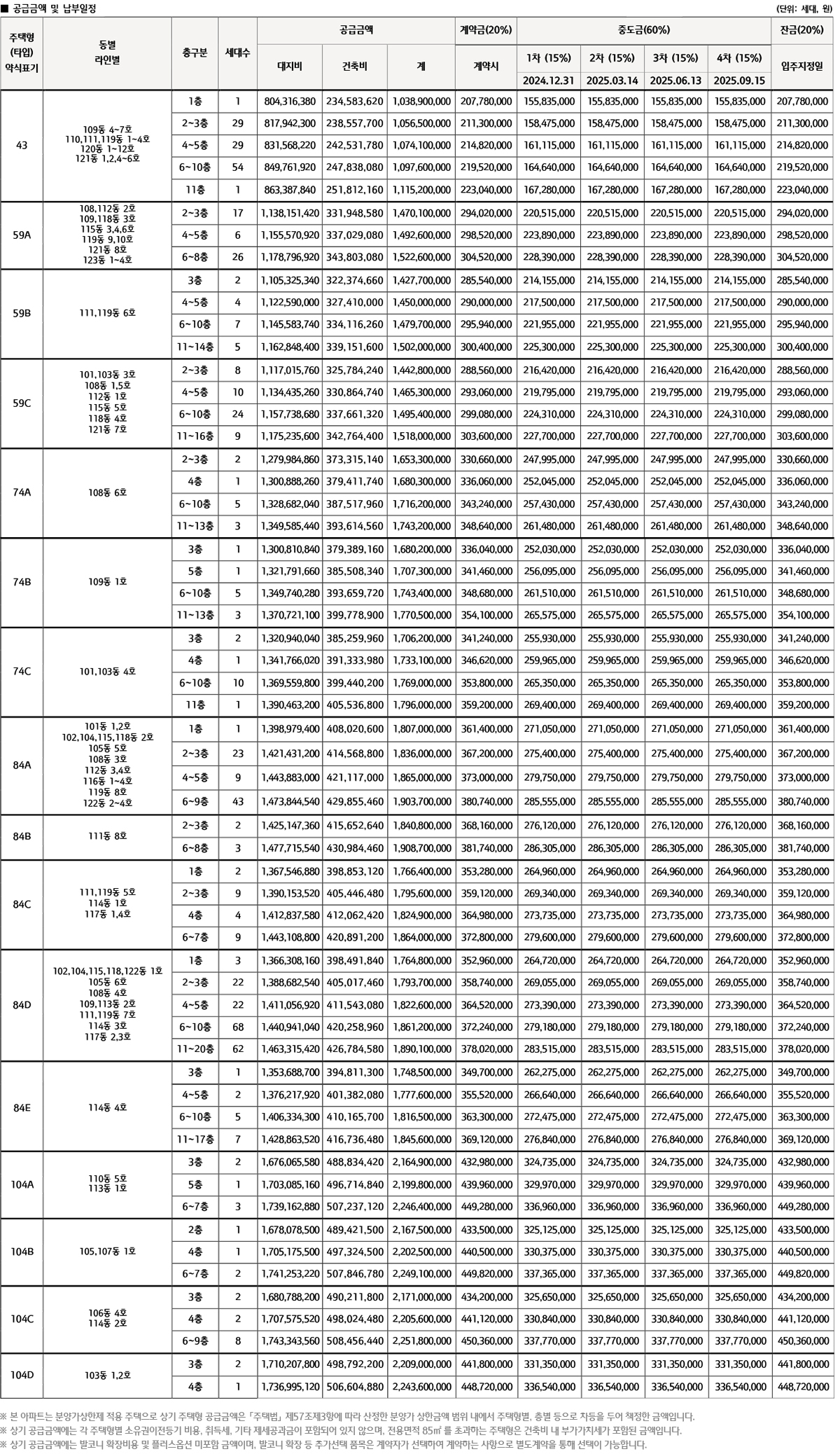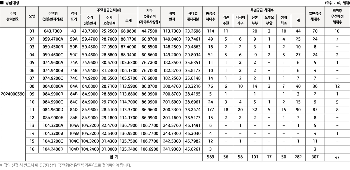 전용면적별 일반분양 가구 수는 △43㎡ 114가구 △59㎡ 118가구 △74㎡ 35가구 △84㎡ 297가구 △104㎡ 25가구 등이다.