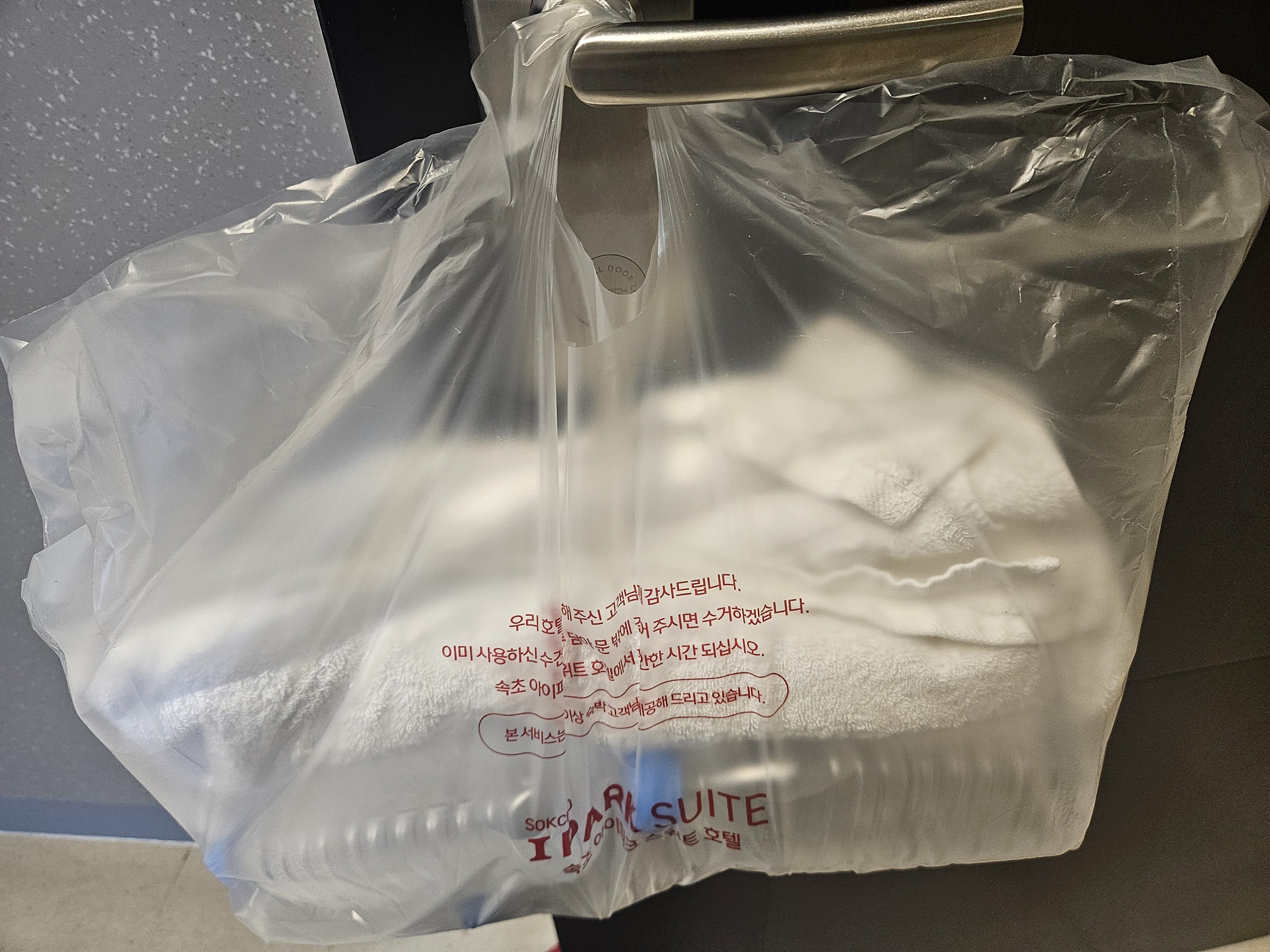 연박이면 생수와 수건, 비누를 문고리에 걸어 둔답니다. ㅎㅎ