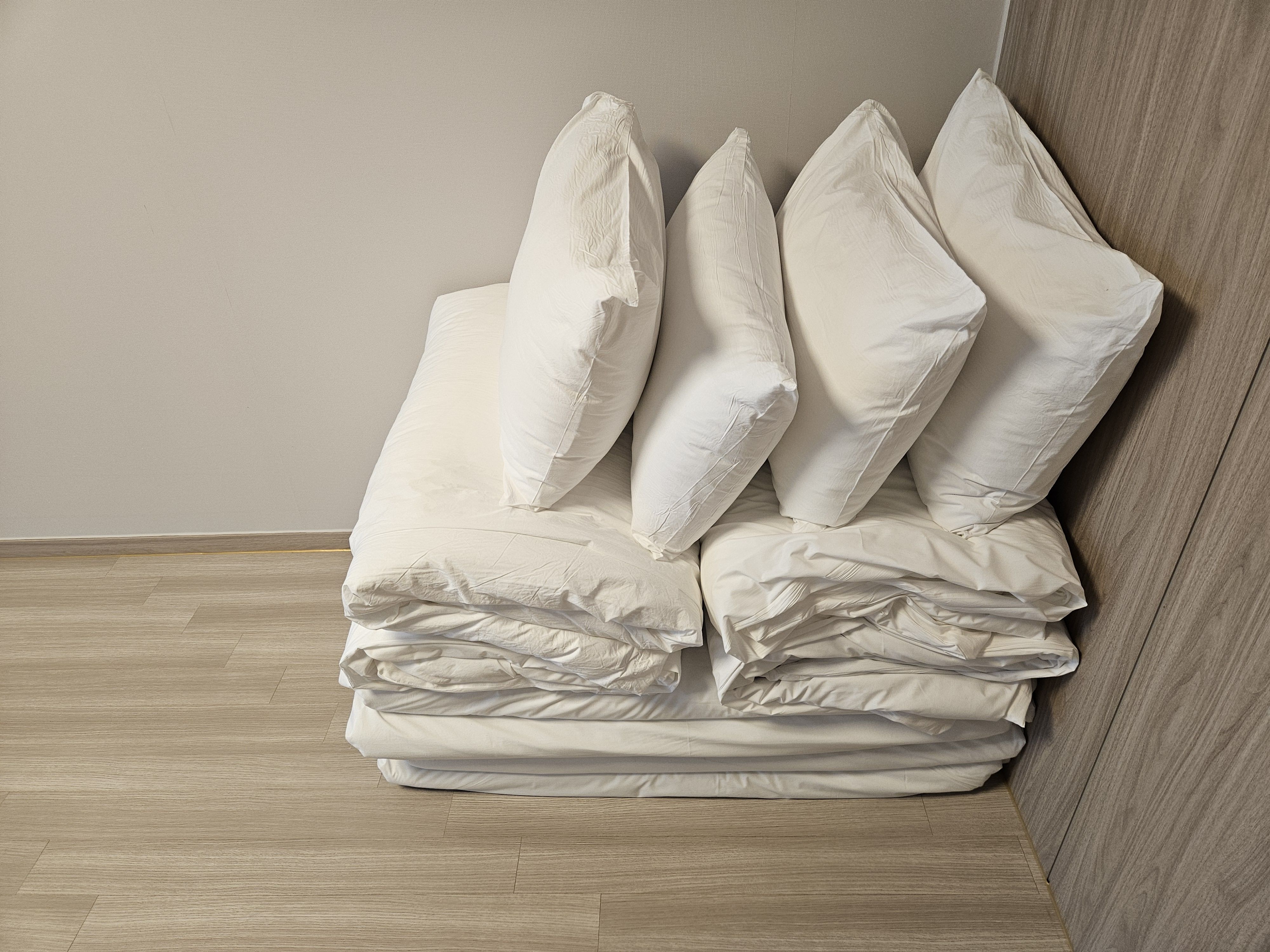 온돌방이라 침구세트가 4개씩 가지런히 정리돼 있어요.